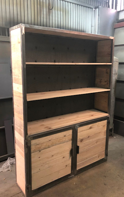 Estructura metalica de hierro acabado envejecido con relleno de madera teñida.